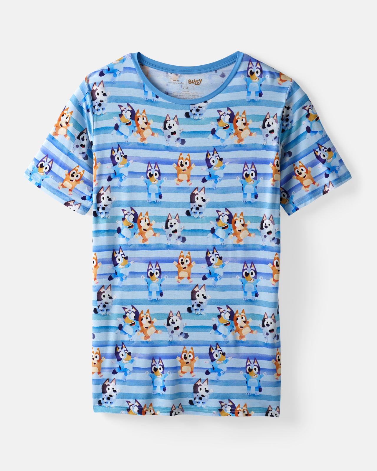 Get in on the Bluey fun! The Bluey Dance All Day Men's Pajama Top features Bluey, Bingo, and Muffin together on a blue striped watercolor-inspired print. Made from ultra-soft Lunaluxe® Bamboo, this men's bamboo pajama top has a relaxed crew neck and short sleeves. Pair with the matching pants to complete the set!