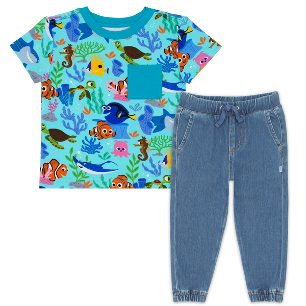 Click to see full screen - Dancing child wearing the Disney Nemo's Reef Relaxed Pocket Tee with denim joggers