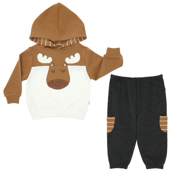 Four kids joyfully hugging each other in a sunny playground, surrounded by green grass and trees wearing hoodies and joggers.