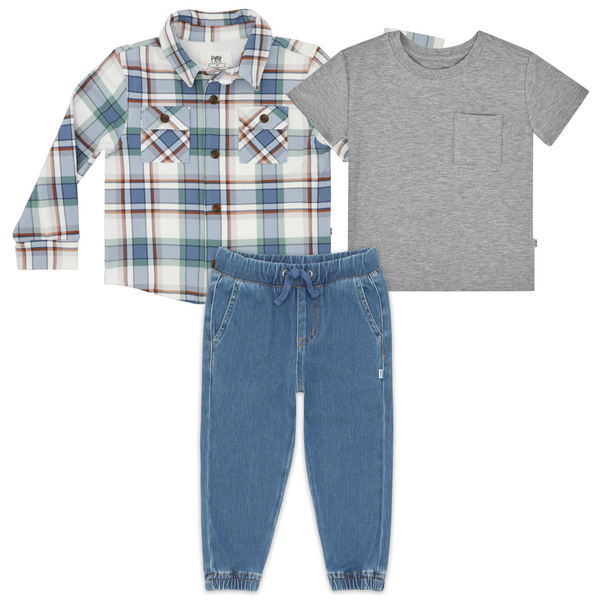 Layer up for autumn adventures! This kids shacket features a classic plaid pattern with functional chest pockets and buttons down the front. Made from durable Soluxe® Bamboo with a French terry interior, it's perfect for layering on crisp days. Mix & match with their fave LS styles!