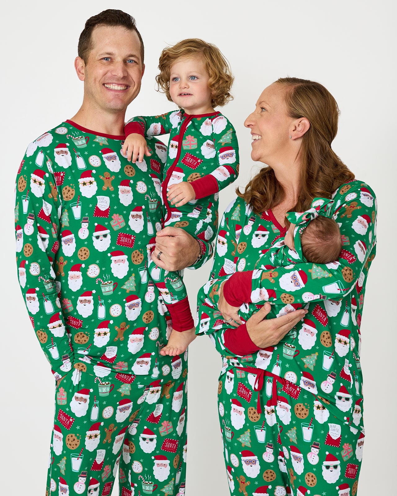 A family of five wearing matching luna neutral print pajamas