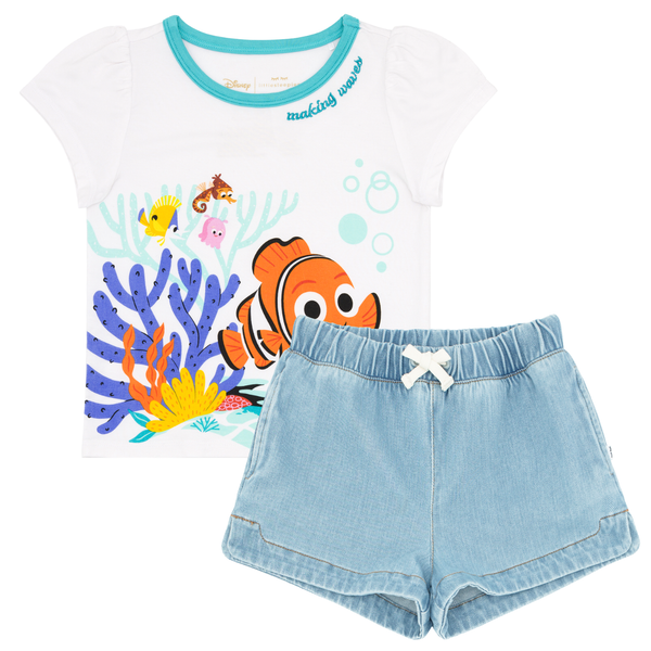 - Click to see full screen - Standing child wearing the Disney Nemo Puff Sleeve Tee and light blue denim shortsAlmost Gone