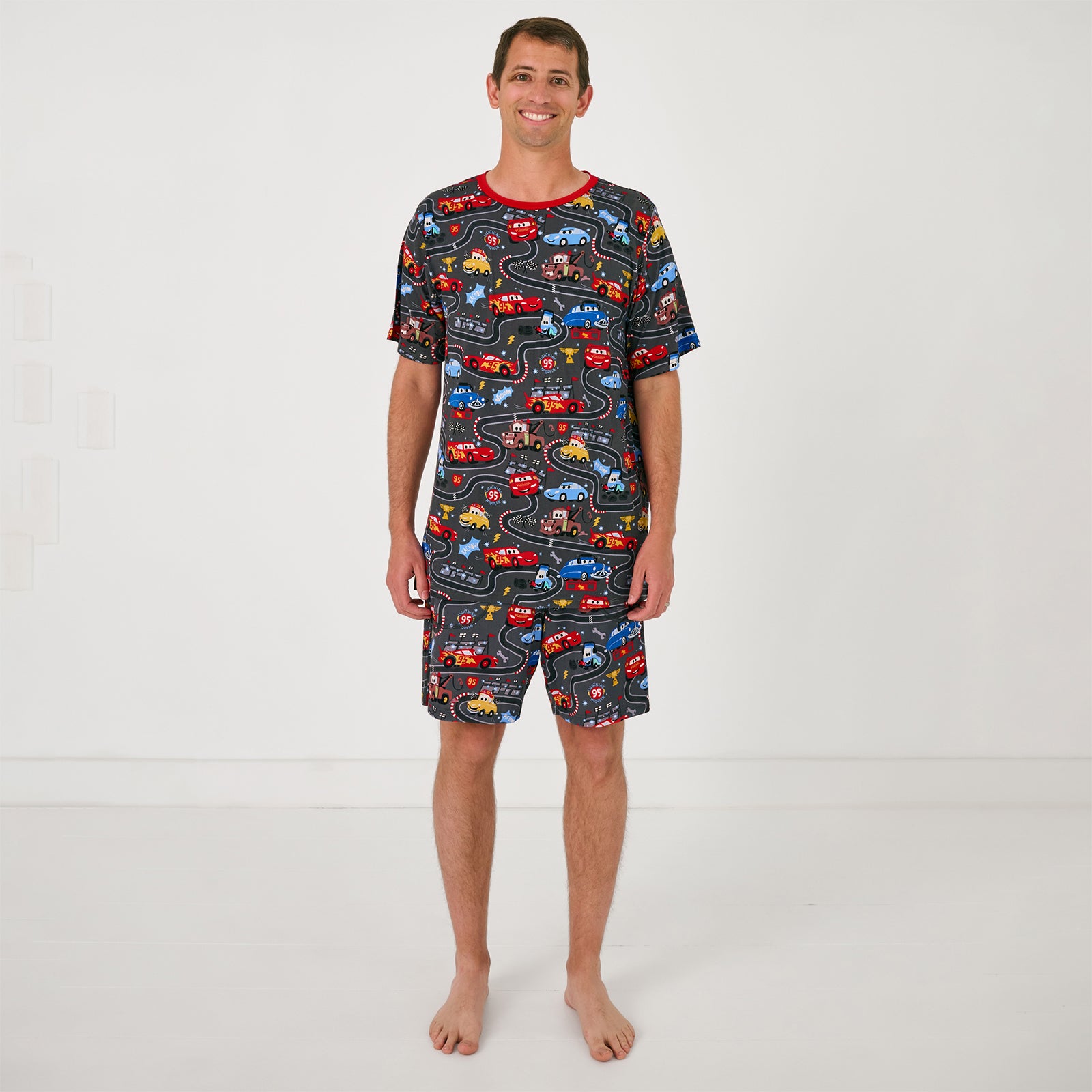 Man wearing the Disney & Pixar Piston Cup Men's Pajama Shorts