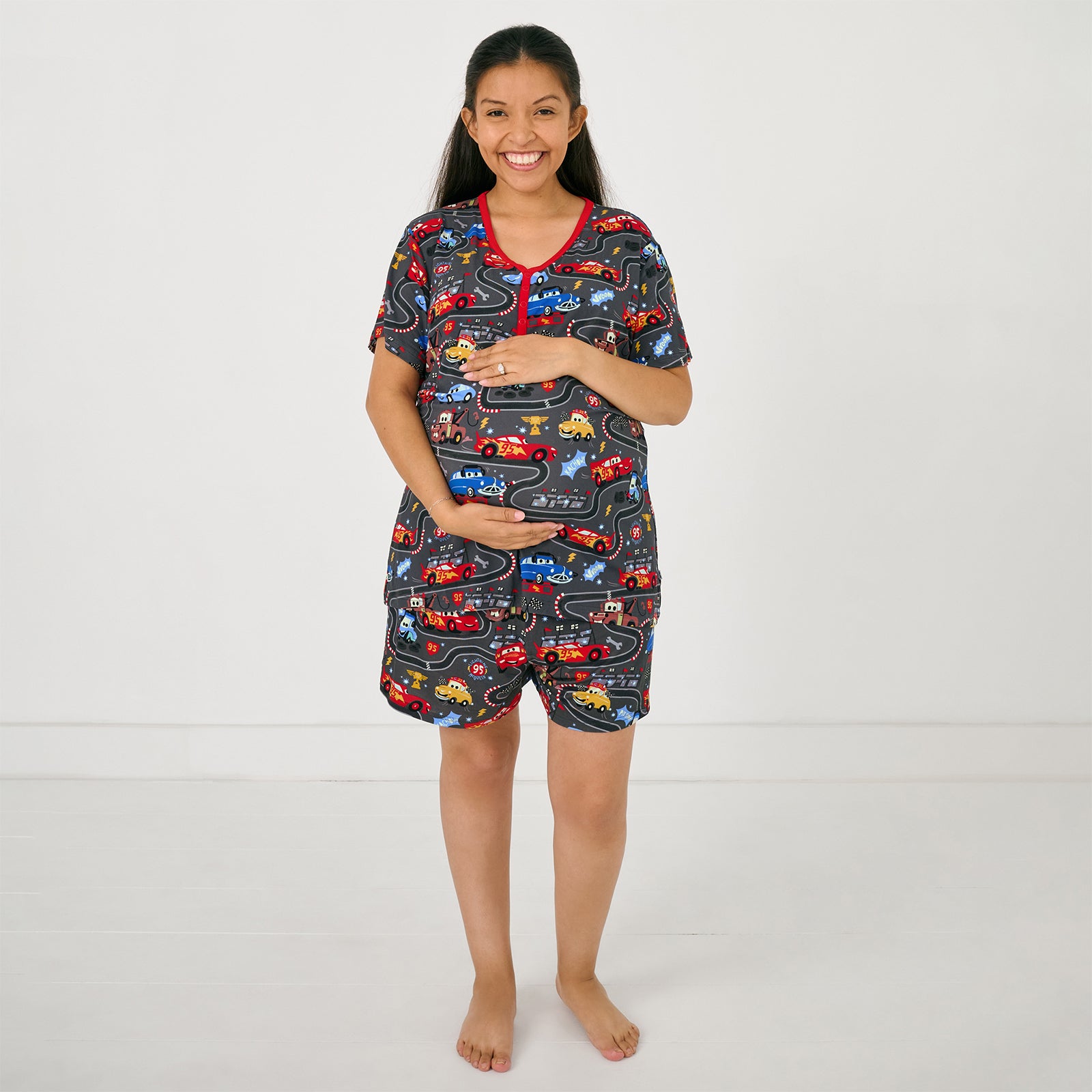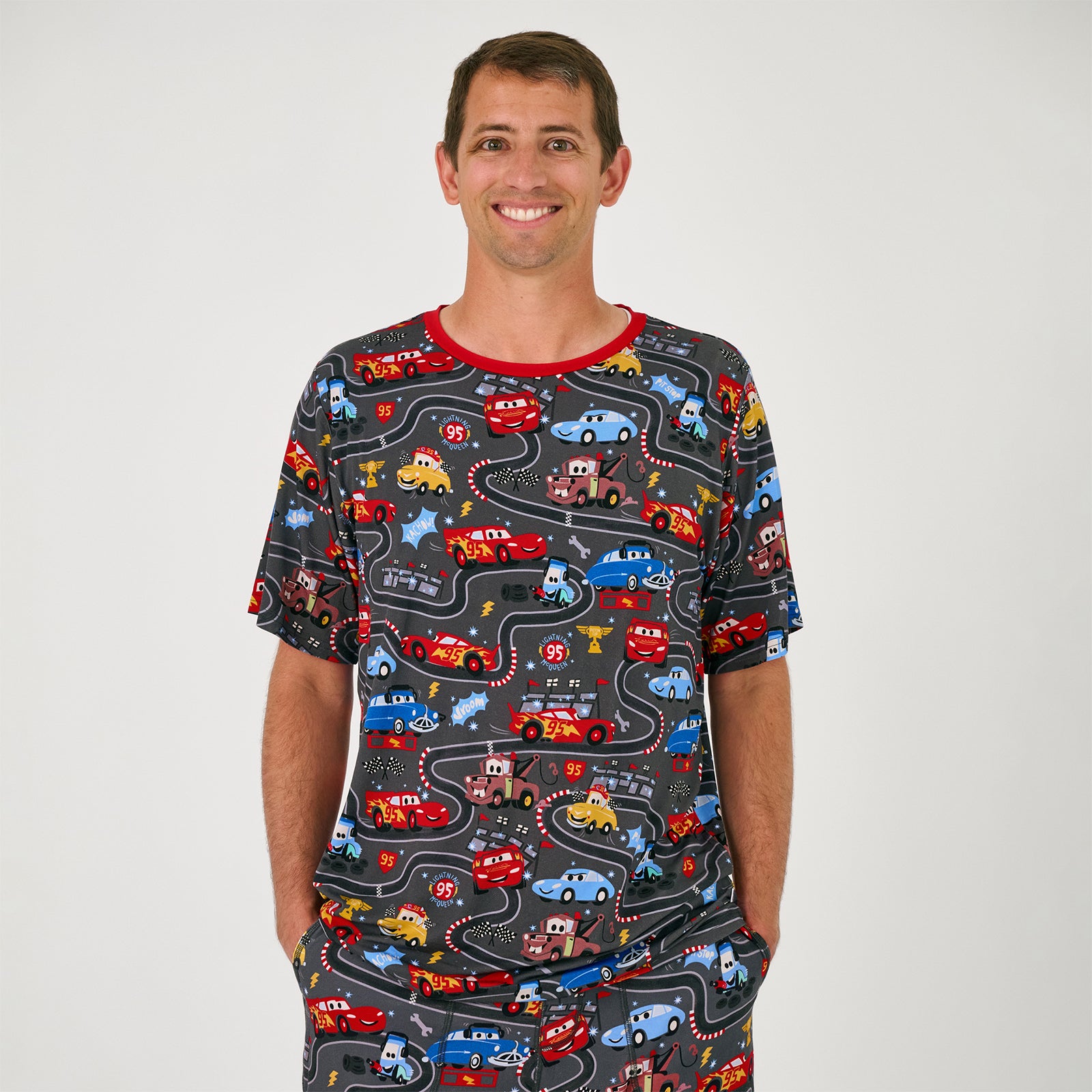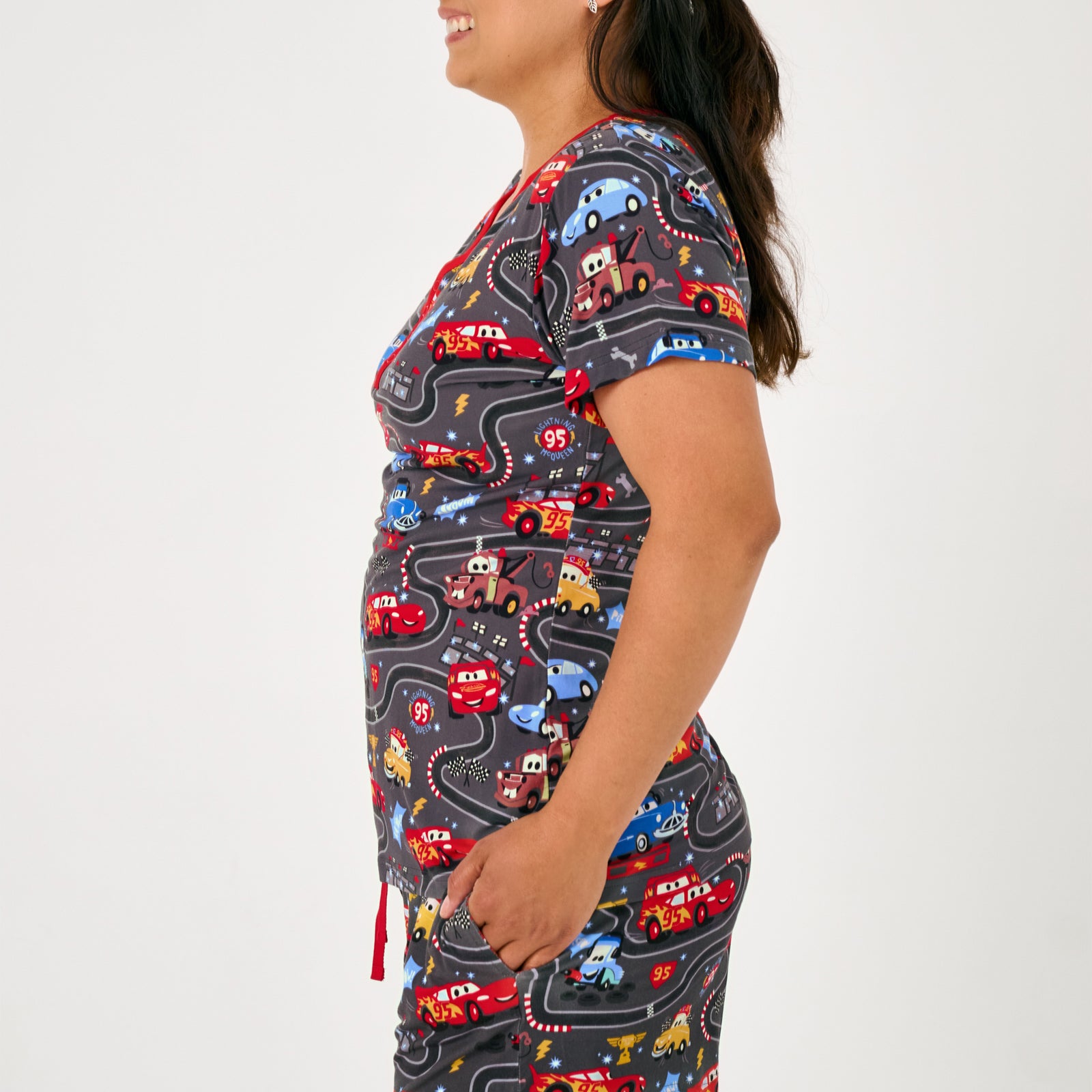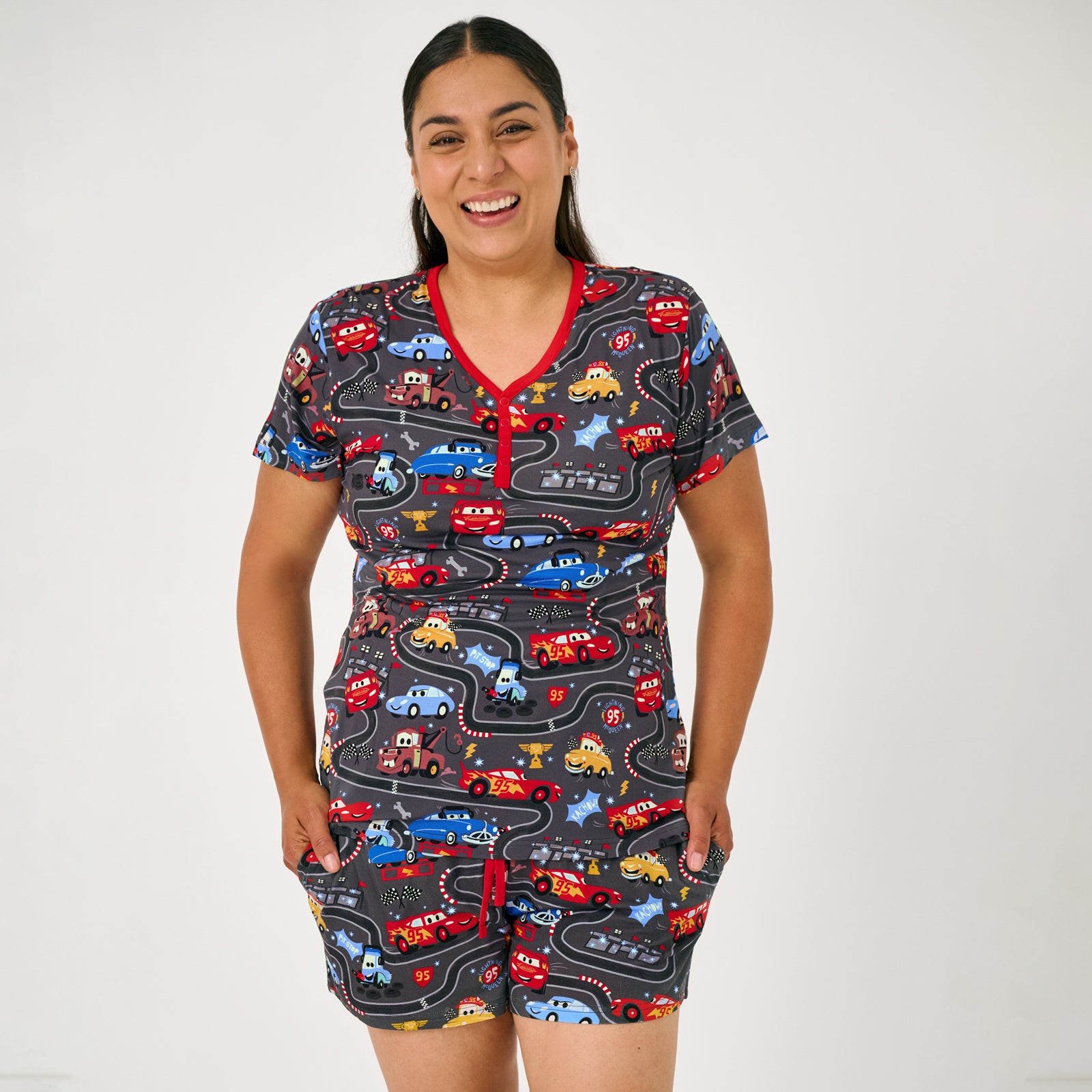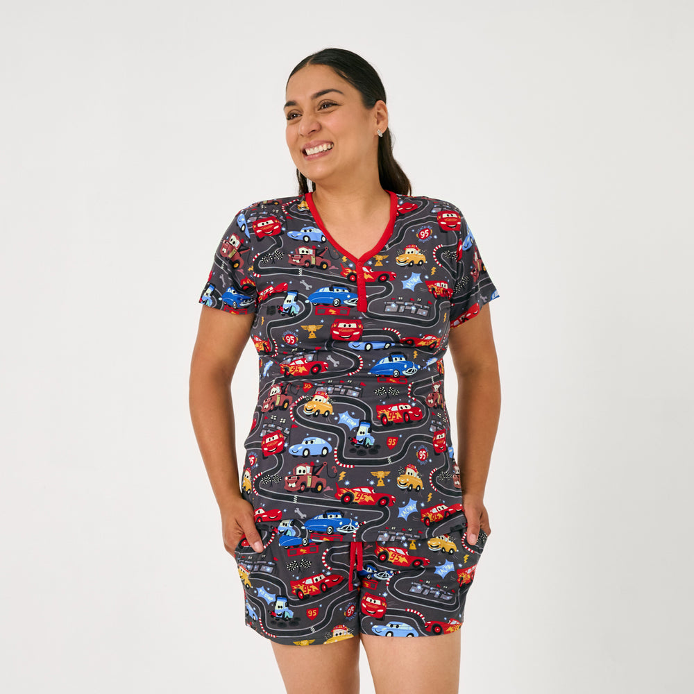 • Standing woman wearing the Disney & Pixar Piston Cup Women's Short Sleeve Pajama Top