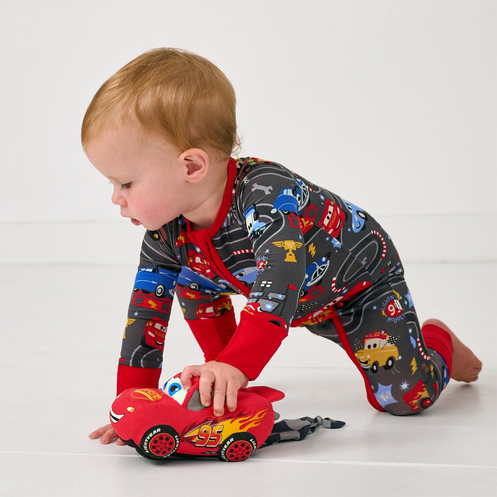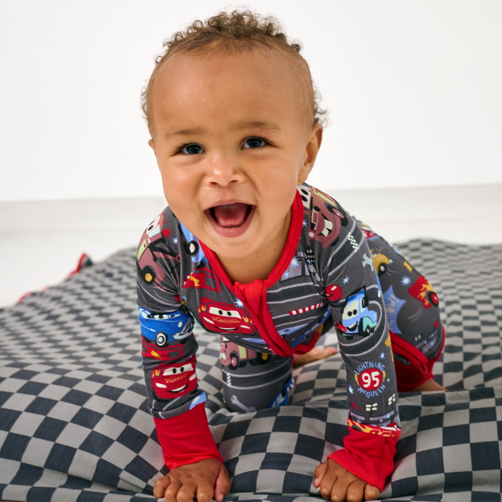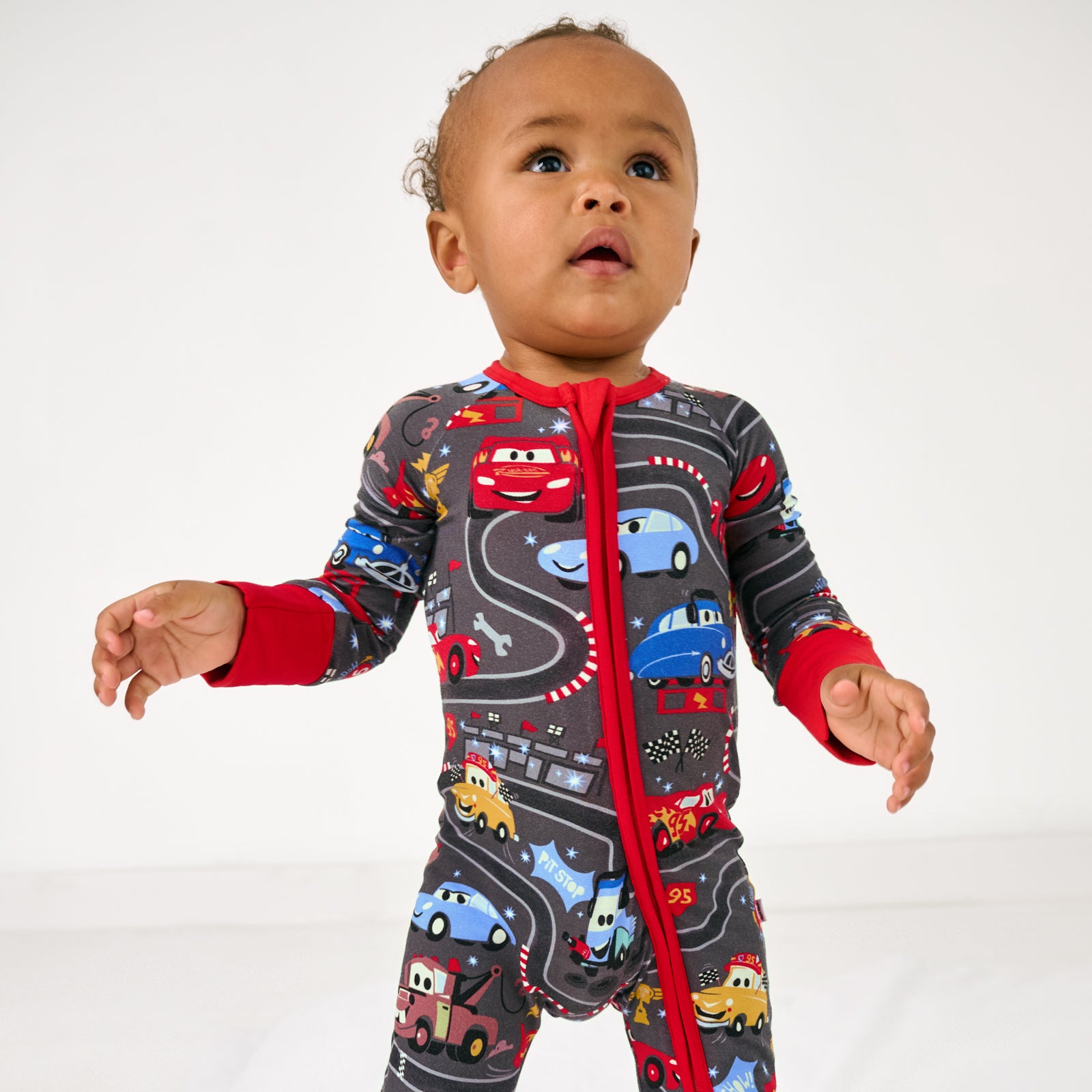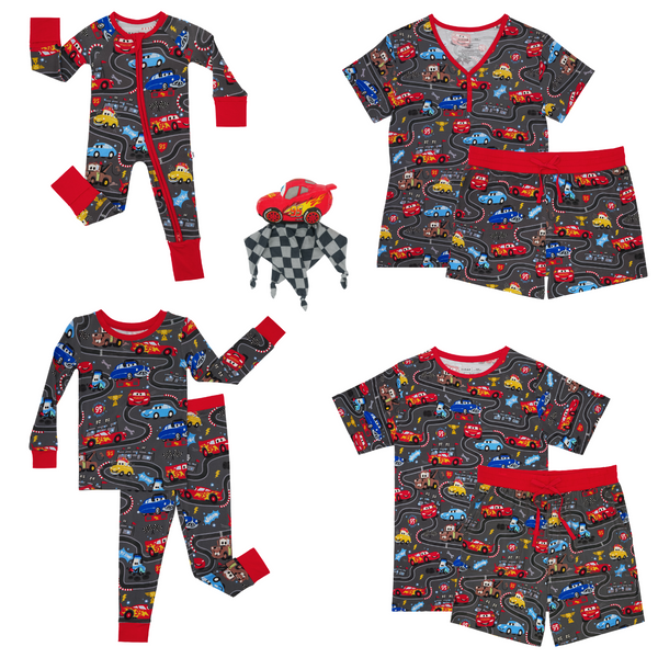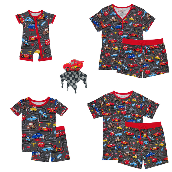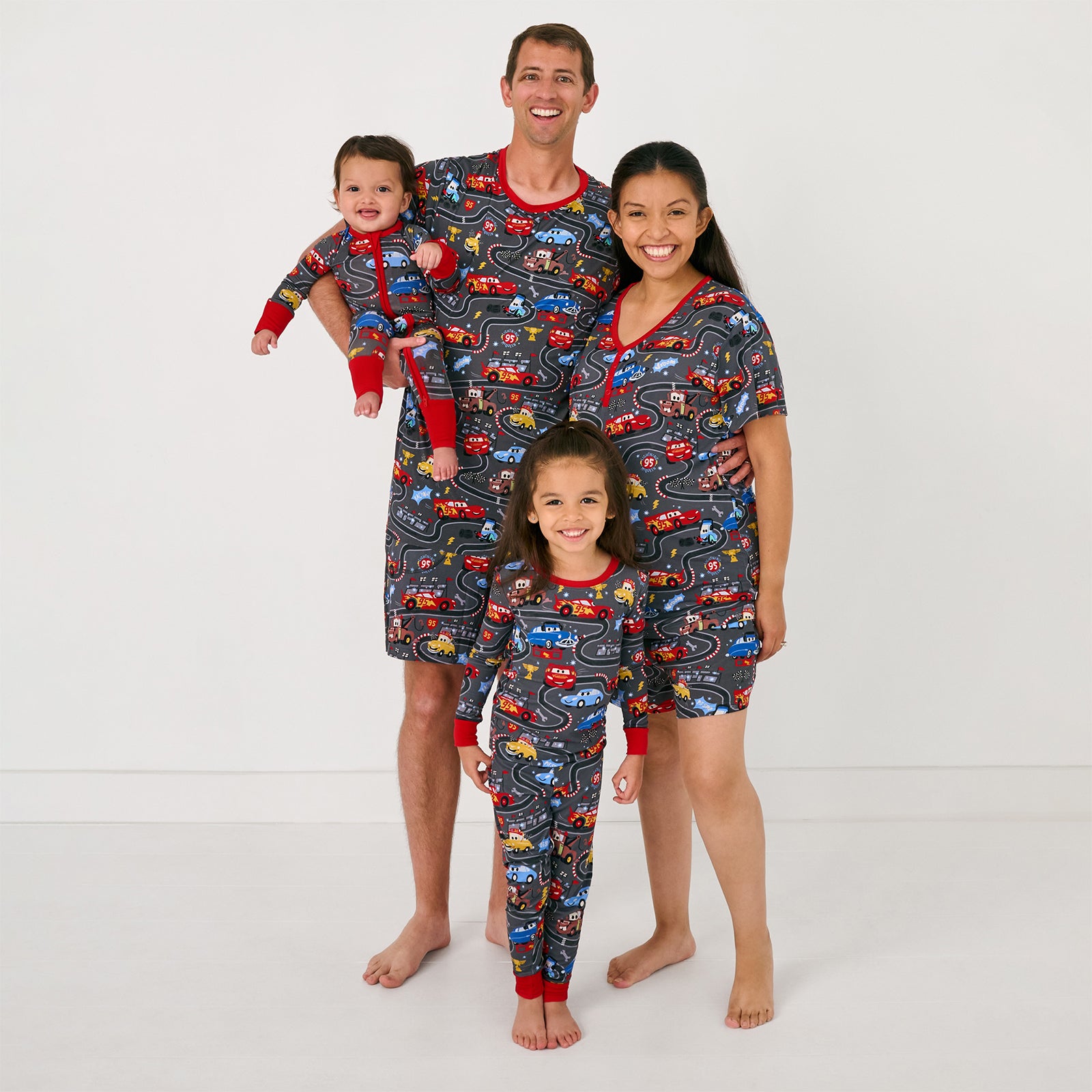 • Standing woman wearing the Disney & Pixar Piston Cup Women's Short Sleeve Pajama Top