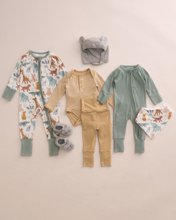The perfect finishing touch for your little cub’s first few months. Made from super soft Soluxe® Bamboo, the Dove Gray Bear Booties are gentle on newborn skin. The encased elastic opening allows for quick dressing, while the baby-safe embroidered details make first moments beary sweet. Comes in a bamboo keepsake bag that doubles as a gift bag. Complete their coming home from the hospital outfit with the matching Dove Gray Bear Bonnet and Zippy!