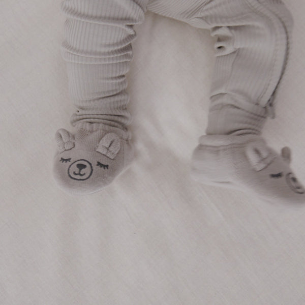 Print Description: The Dove Gray Bear Booties are warm gray and feature 3D ears and an embroidered sleepy bear face.
