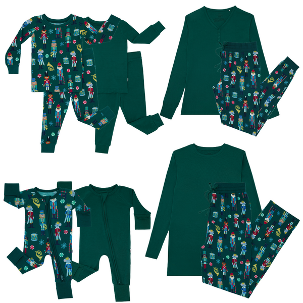 Click to see full screen - Family of six sitting on a couch wearing matching Nutcracker March pajamas