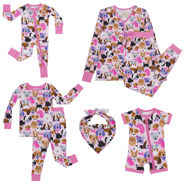 Snuggle up with playful pups! The Pink Puppy Parade Shorty Zippy showcases an adorable mix of dogs with cute accessories like bows and bandanas! Made from buttery soft Lunaluxe® Bamboo, this breathable sleeper is gentle on sensitive skin and perfect for mommy and me matching. With a double zipper for easy changes, it’s convenient as can be. A must-have for dog lovers!