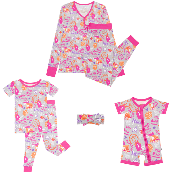 Print Description: The Pink Slam Dunk print features a heather gray background with basketballs, jerseys, pennants, shoes, and basketball hoops. Stars and phrases such as win, dunk, dribble, and more are scattered throughout in pink. The trim is a vibrant pink.