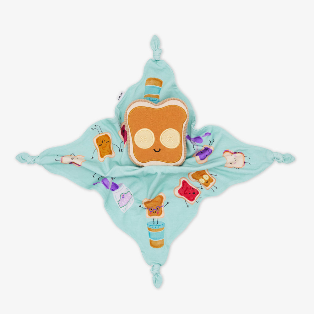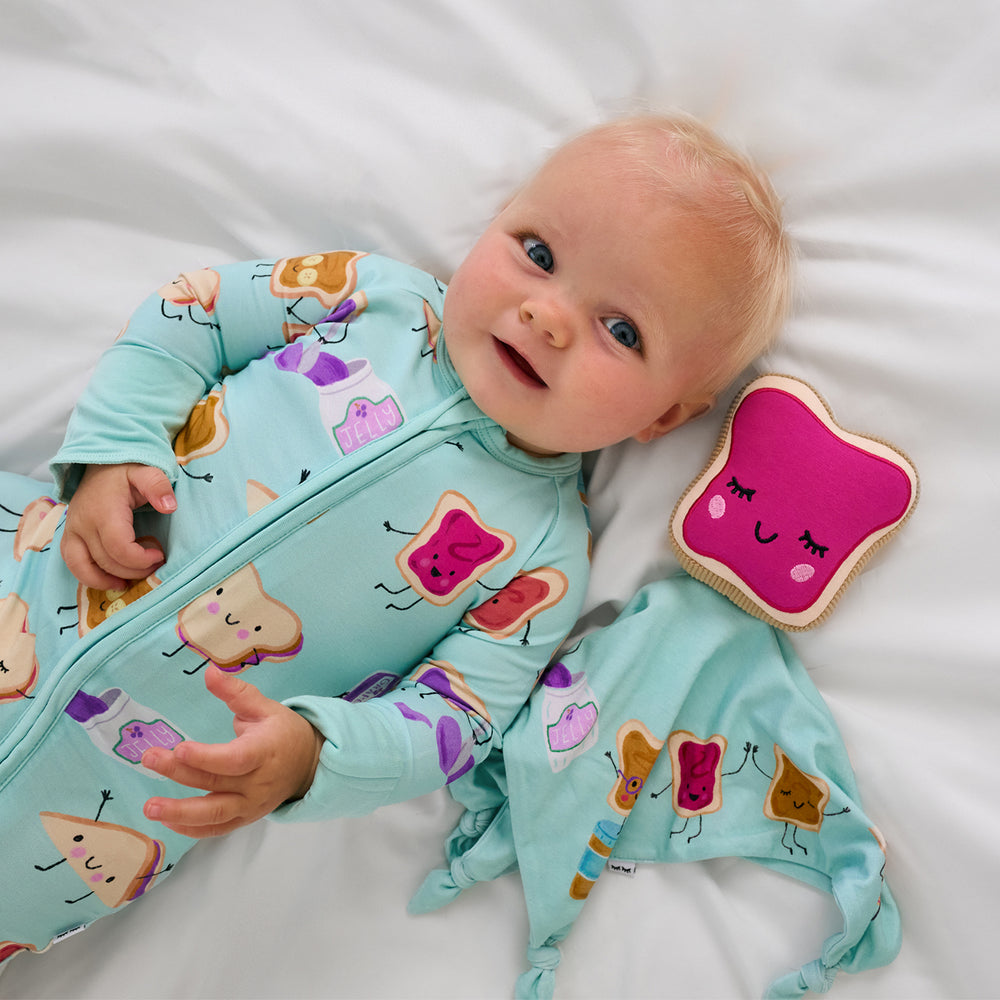 From lunchtime to snuggle time, Sammie the PB & J Sleepyhead Lovey is here to spread love! Featuring a plush two-sided sammie on top and buttery soft bamboo security blanket on bottom, it’s comfort food in lovey form. Match it perfectly to their Lunch Buddies pajamas for a look that’s love at first bite! Made from our signature Lunaluxe® Bamboo, this sweet and salty sammie is oh-so soft and gentle on sensitive skin.