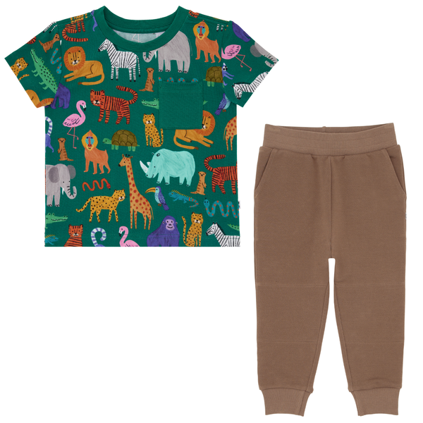 Click to see full screen - Boy wearing the Wild Zoo Relaxed Pocket Tee with joggers
